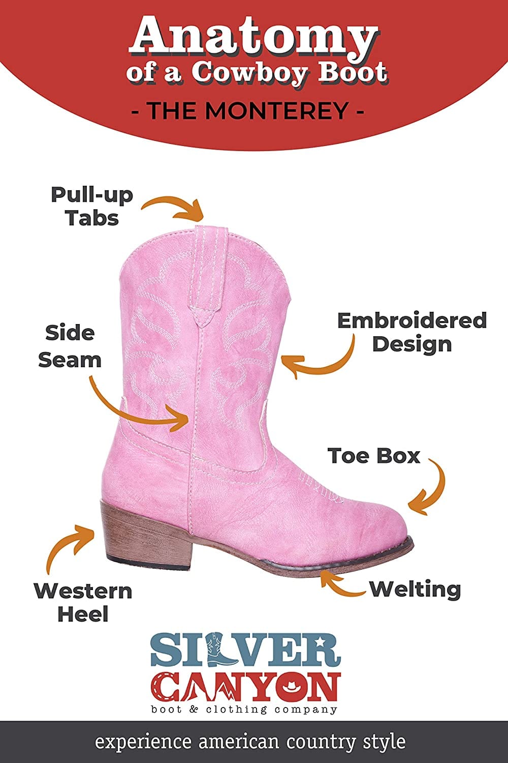 - STITCHED DESIGN The Monterey by Silver Canyon is a Super Cute Cowboy Boots for Boys and Girls with Classic Western stitching on shaft and foot